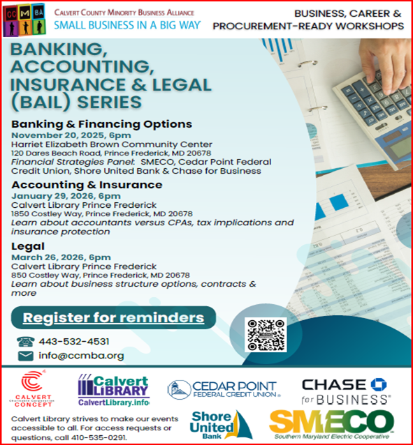 Banking, Accounting, Insurance and Legal Workshop Series. Join CCMBA and community partners for a Banking Financial Strategies Panel with SMECO, Cedar Point Federal Credit Union, Shore United Bank and Chase for Business. Learn about financing options for your business and how to “be bankable.” Partners also include the Calvert County Library and C4 (Calvert Charitable Concepts Corp). Thank you to Shore United, SMECO, and C4 for sponsorships.